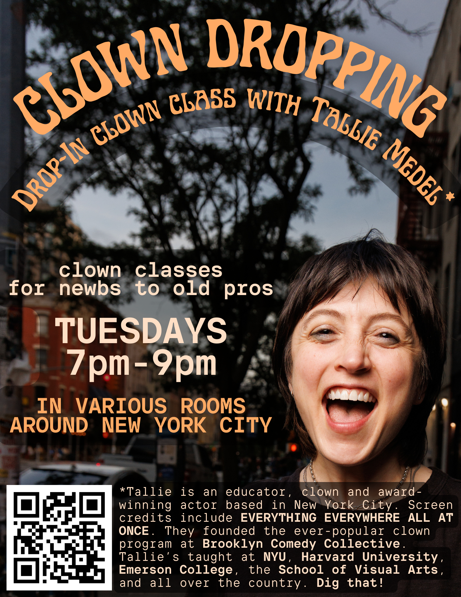 “Tallie Medel is an absolute genius performer and a treasure of a teacher. Her experience on stage and screen gives her a unique insight into the sensitivities of all performers, and her empathy seeps into every interaction with her students. She is a lover of comedy and truth and you will learn and make discoveries in both of these areas when you take a class with her. She also loves the silly and she expertly and enthusiastically brings it out of everyone, from the most experienced and ‘serious’ performer to the absolute novice. Being in Tallie’s class is a joy, not just because of her warm and spirited presence, but because of the way in which she creates a safe and supportive environment for all to play. I loved my clown class with her so much I never wanted it to end!”